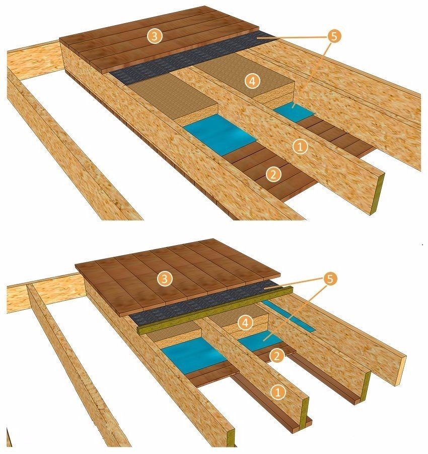 Перекрытие для первого этажа следует выполнить с гидроизоляцией. Установить его нужно, таким образом, чтоб оставалась прослойка для проветривания. Такой способ позволит сохранить целостность конструкции на долгий период.