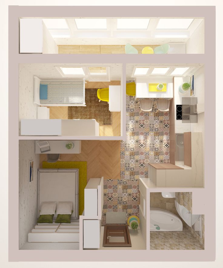 Вариант организации в квартире единого пространства предназначен для проживания одного человека или семьи из двух человек. Например, молодой семьи, ведущей достаточно «бурный» образ жизни, или для одинокого холостяка. В этом случае, сломав все стены, можно получить единое пространство, разделенное на зоны — здесь спят, здесь едят и т. д. Для большей семьи такой подход абсолютно не подходит — для семьи нужны комнаты, особенно если в ней есть дети и пожилые люди.