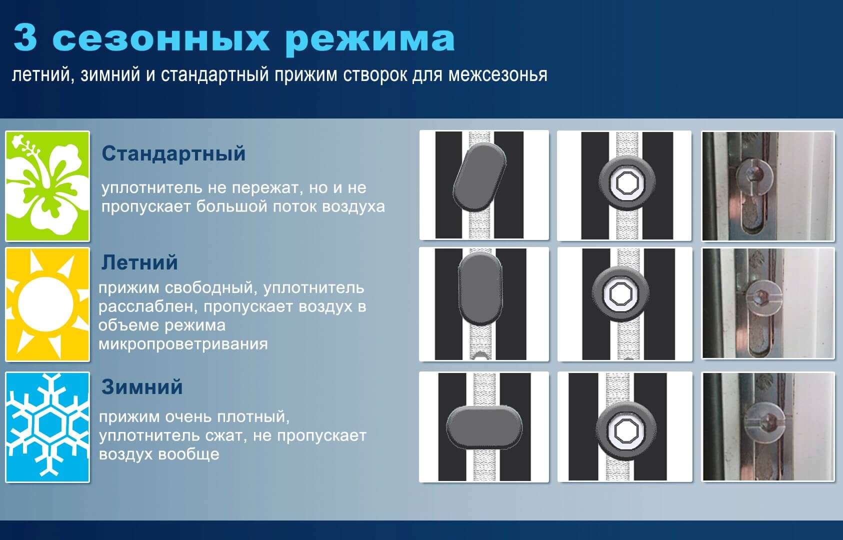 Летний и зимний режимы, как основные, обеспечивают защиту внутренних помещений от сквозняков, гарантируют комфорт и герметичность пластиковых окон в зависимости от времени года.