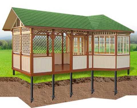 - Если беседка будет устанавливаться на неровном участке, чтобы выровнять рельеф грунта, её так же можно поднять на сваи.