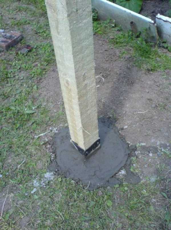 - Возведение конструкции на участке начинают с монтажа опор. В качестве столбов используют брус 100х100 мм. Наиболее простая и надежная технология установки опор — бетонирование в скважине, выкопанной ниже уровня промерзания грунта. Глубина скважины должна быть не менее 1 м. Общий принцип данной технологии отображен на фото.