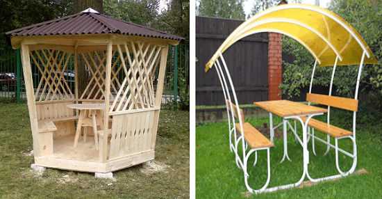 Сооружение применяется в качестве навесной конструкции, в целях обустройства уютной беседки для отдыха. Данная конструкция надежно защищает от солнца, но не от дождя. Это необходимо иметь в виду. Это могут быть модели с выдвижными тентами.