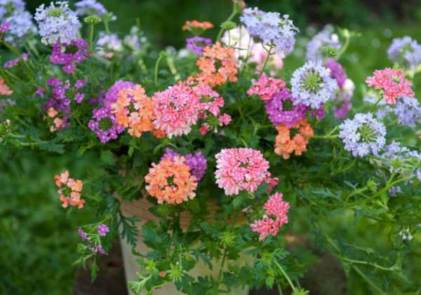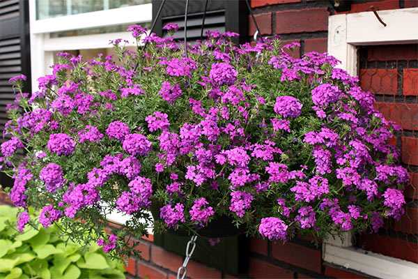 Немало искренних почитателей и у вербены. Она является однолетним растением, но хорошо переносит зимние морозы. Высаживают цветок в подвесные конструкции. Длина свисающих стеблей достигает метра, разрастается вербена быстро. Зацветает растение практически с приходом весны. В цветовой гамме есть розовые, синие, красные, фиолетовые оттенки. Роскошное цветение вербены будет продолжаться до конца осени.