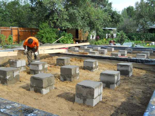 Для столбчатого варианта из кирпича или в блочном исполнении под столбы углубляют траншеи до 400 мм, и делают щебеночную подушку, чтоб исключить капиллярный подсос грунтовой воды. По подушке устраивают гидроизоляцию из рулонного материала. Кладку опорных столбов делают с обязательной перевязкой, габарит столбов и зависит от толщины будущих несущих стен. Готовую кладку обмазывают за два раза битумом или битумной мастикой. Вертикальную гидроизоляцию – отсечку выполняют рулонным материалом. Затем приступают к устройству стен.