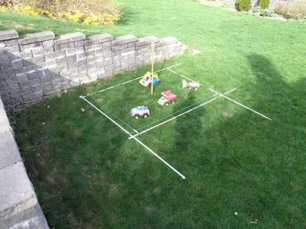 Для начала стоит разметить участок, который был выбран для построения песочницы. Для этого потребуется шнур, лента для разметки и 4 деревянных кола. Разметка участка предполагает проведение работ в следующей очередности: