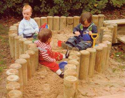 Любое бревенчатое строение, даже такое небольшое, как песочница с размерами, приведенными в полное соответствие с отведенной для игровой зоны площадью, требует аккуратности. Привезенные на участок бревна нужно очистить от коры и оставить их полежать в защищенном от солнца и проветриваемом месте для просушки. После этого кладется маленький сруб — точно так же, как это делается при строительстве бревенчатого дома. Если дом и постройки выполнены из оцилиндрованного бревна, то песочница выполняется тоже из оцилиндрованного бревна, чтобы не нарушалась целостность композиции.