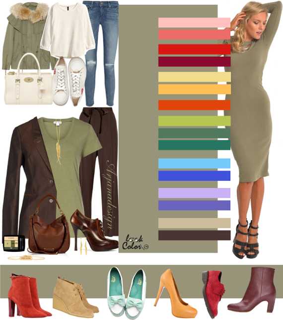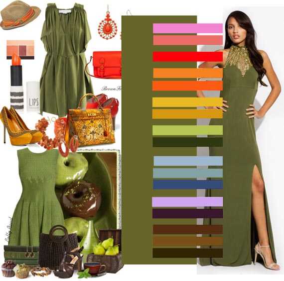 | Какой цвет сочетается с оливковым | К оливковому добавляют в одежде фиолетовый, вишневый, красный, тон коралла и даже хаки. Можно использовать ярко-красный или нежный зеленый оттенок. |