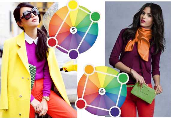 (5) и (6) Сочетание тетрада. Оно представляет из себя две фигуры: прямоугольник и квадрат. Эта комбинация представляют из себя две пары дополнительных цветов. Они вполне могут существовать без одного из цветов, но не более.