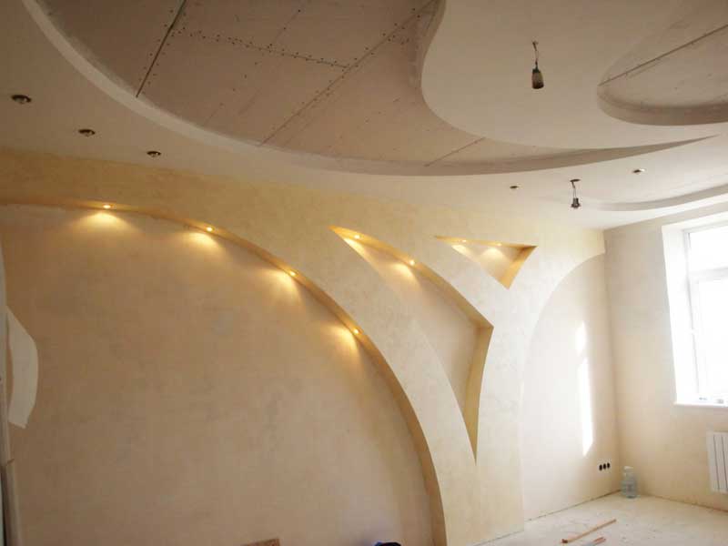 Використання гіпсокартону для оформлення покриттів стелі в житлових приміщеннях обумовлюється характеристиками як самого матеріалу, так і можливостями, які він надає для втілення в життя неординарних дизайнерських розробок. ГКЛ – дуже пластичний, що дозволяє створювати складні багатоярусні конструкції та фігури самої різної форми: