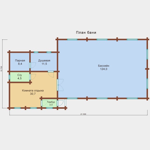 На фото выше чертеж бани, где выходы из душевой и парной ведут к бассейну, совмещенному с комнатой отдыха.