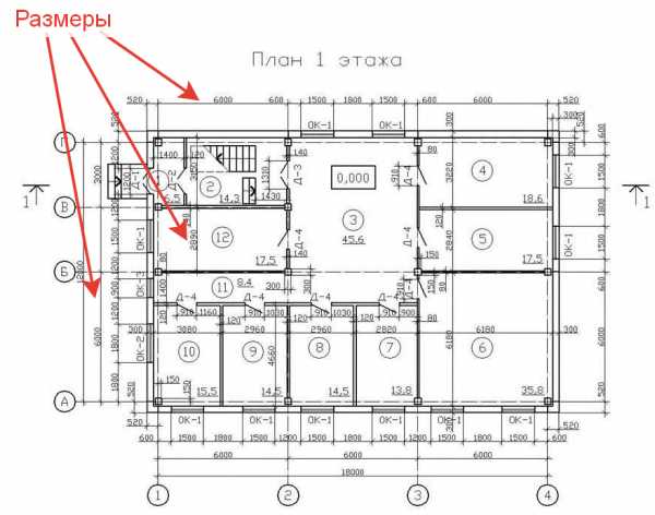 На поэтажном плане подвала, цокольного и первого этажей следует проставлять наружные размеры по периметру стен.