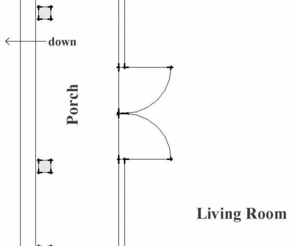 Французская или двойная дверь обозначаются двумя дугами, словно они собраны из двух обычных дверей. Зная, в какую сторону они открываются, можно заранее подобрать мебель и спланировать её расположение ещё в строящемся доме.