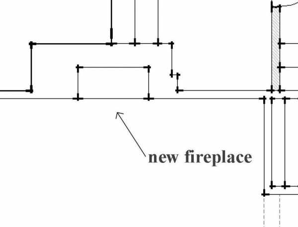 Камин также чертится на плане. Выглядит он как два прямоугольника, внешний – это лицевые его стенки, а внутренний иллюстрирует топливник.