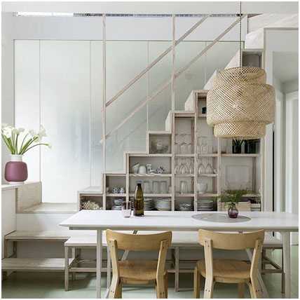 Также лестничную конструкцию можно установить посередине гостиной, чтобы разделить помещение на зоны. Данный вариант отлично впишется в комнату, которую нужно зрительно разделить на столовую и место отдыха.