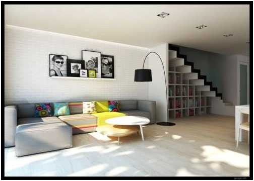 - Современный минимализм. Такой стиль отличается лаконичностью, гармоничностью и использование спокойных цветов. Для гостиной в таком стиле в качестве лестницы можно использовать ступени, выступающие из стены.