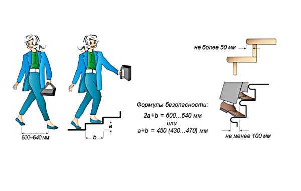 - Ширина шага. Это база для проведения дальнейших расчетов. Под шириной шага подразумевается сумма размеров двух проступей и одного подступенка. В итоге получается расстояние в 60-65 см, которое согласно СНиП является наиболее удобным для передвижения человека как в горизонтальной, так и вертикальной плоскости.