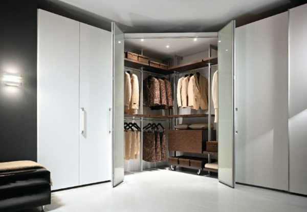 В проект угловой гардеробной комнаты нужно включить широкий вход. Идеальный вариант — это дверь-гармошка. К тому же при такой планировке можно не заботиться о стенах.