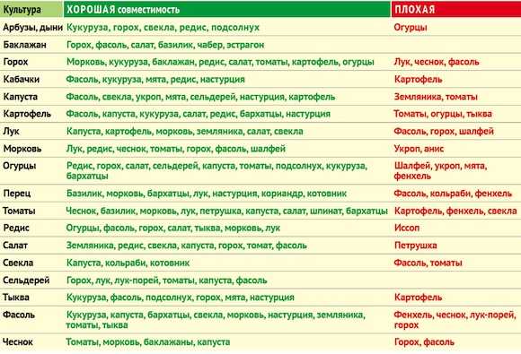 Эффективно использовать грядки можно только если сочетать посадки, смешивая разные совместимые растения. Получается существенная экономия пространства, все подробности в таблице: