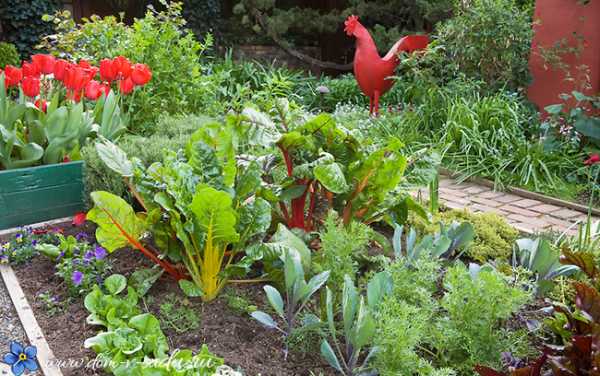 Ornamental edible garden mixed bed of herbs, vegetables (with rainbow chard), and flowers between paths in Rosalind Creasy front yard gardenПомогают от вредителей (для этого обязательно нужна планировка сада и огорода):