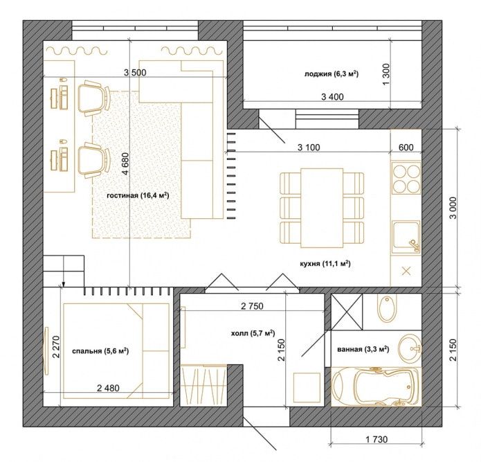 Но следует помнить, что если на кухне газ, то кухню следует изолировать от гостиной. Оптимальный вариант для одного человека или молодой семейно пары.