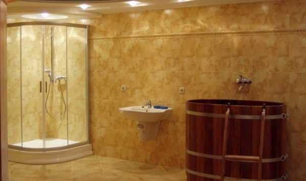 - Немного места займет размещения в мойке обливной конструкции – ведра, которое позволяет охладиться после посещения парилки;