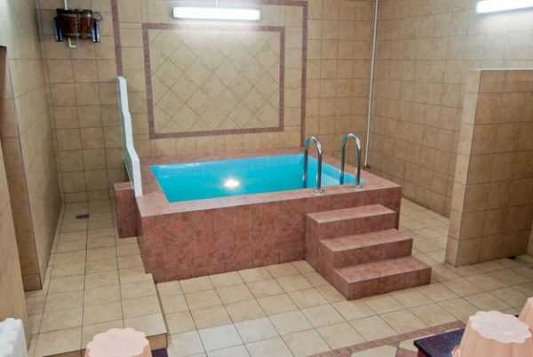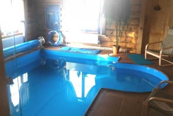 А разместить сам бассейн можно в присоединенном к бане помещении, под поликарбонатным козырьком или солидной крышей и стеклянными стенами, и в самой парной – отдав для этого сооружения достаточно большую комнату. В любом случае после пара окунуться в чистую прохладную воду будет очень и очень приятно.