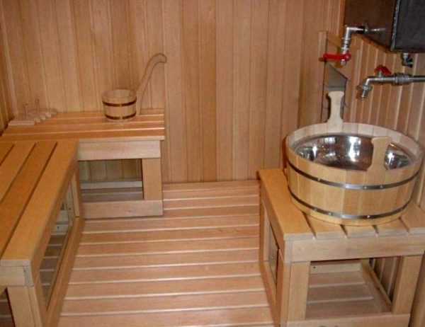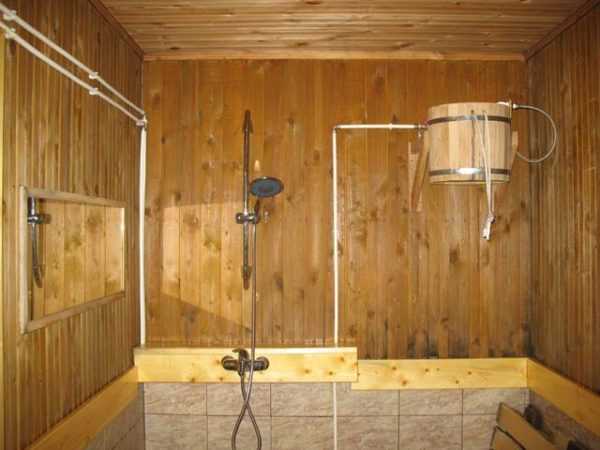 Отдельно расположенное помещение мойки требует подвода как минимум горячей воды. Если нагрев предполагается от основной печи, следует заранее продумать планировку помывочной таким образом, чтобы ввод в неё воды из парной был удобен.