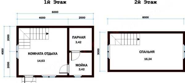 Вариант планировки одноэтажной бани - Компактная двухэтажная баня, состоящая из раздевалки, парилки и мойки на первом этаже и комнаты отдыха – на втором. Подобная конструкция пользуется популярностью у владельцев небольших участков. Если предполагается часто принимать в бане большие компании, а площадь под постройку невелика, помогает перенос комнаты отдыха на второй этаж. При этом второй этаж может быть полноценным или мансардного типа.