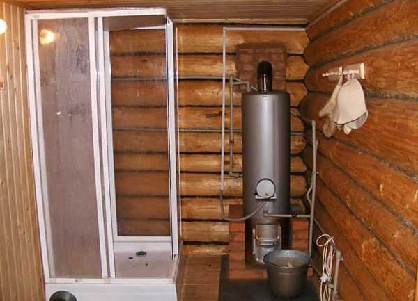 В небольших помещениях, совмещающих парилку и помывочную, коммуникаций обычно не делается. Холодная вода приносится вручную, а горячую берут непосредственно из бака, расположенного в теле основной печи.