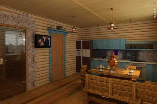 Вариант проекта и планировки бани из бруса с помывочной и кухней