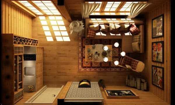 Мансарда, как правило, размещается на втором этаже. Данная комната предназначается для послебанного отдыха, поэтому в ней желательно разместить удобные диваны и кушетки.