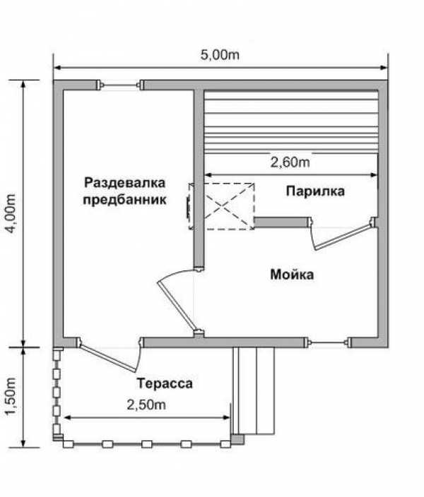 Планировка одноэтажной бани 3х5 с помывочной - Одноэтажная экономичная постройка, включающая в себя предбанник, парную и помывочную. Такое вариант строения наиболее широко распространен, так как содержит больше, чем минимальный набор помещений, сохраняя относительно невысокую стоимость возведения.