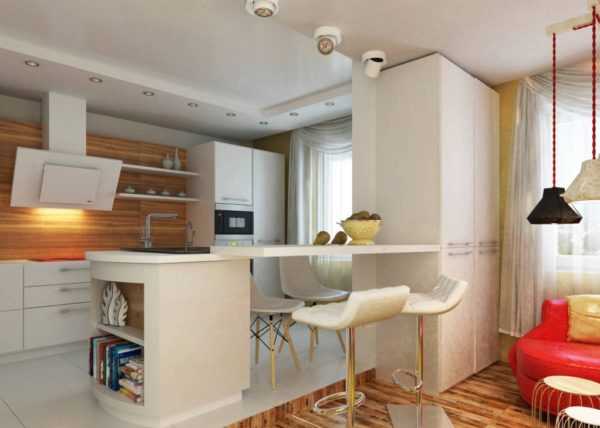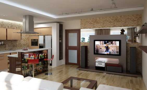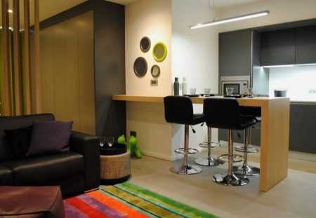 С помощью барной стойки также легко разделить зону гостиной-спальни и кухню. Для этого часто создаются гипсокартонные конструкции, из которых организуется стойка.