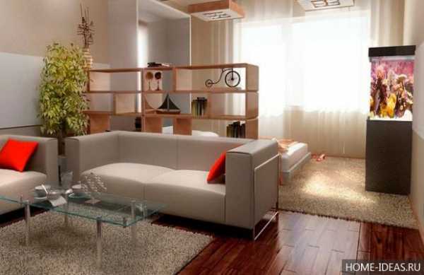 Жилое помещение прямоугольной формы часто имеет только одно окно. В таком случае создать максимально комфортные зоны довольно сложно. Один из вариантов планировки предполагает расположение зоны спальни у окна. Эта часть пространства отделяется от другой территории неполными перегородками, ширмами. Далее располагается кухня. Из-за отсутствия источника естественного освещения на кухне необходимо интенсивное освещение как общее, так и местное.