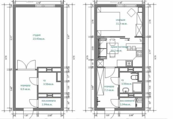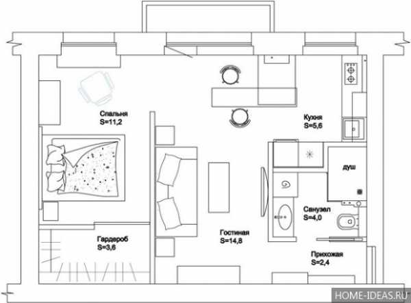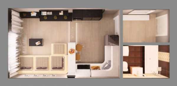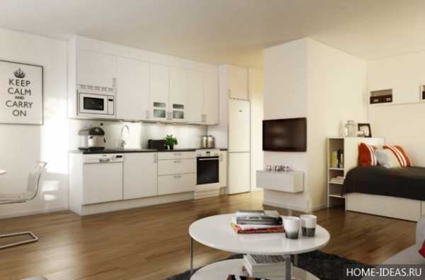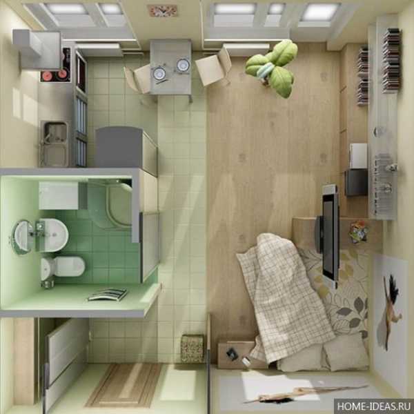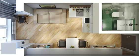 Эффективным решением является размещение спальни у окна, а перед этой зоной располагается кухня-столовая, а затем прихожая. Площадь каждой области довольно маленькая, и поэтому важно использовать трансформирующуюся мебель, очень компактные детали интерьера и встроенное освещение.