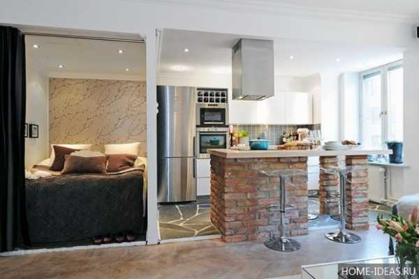 Наличие в квартире двух окон позволяет разделить пространство на две полноценные комнаты капитальной перегородкой. Конструкция из гипсокартона — оптимальный вариант для зонирования. Сплошная стена с дверь-купе обеспечит уют и комфорт. А также стена может быть неполной. Сооружение в таком случае представляет собой фигурный элемент, стилизованную барную стойку или другой вид конструкции.