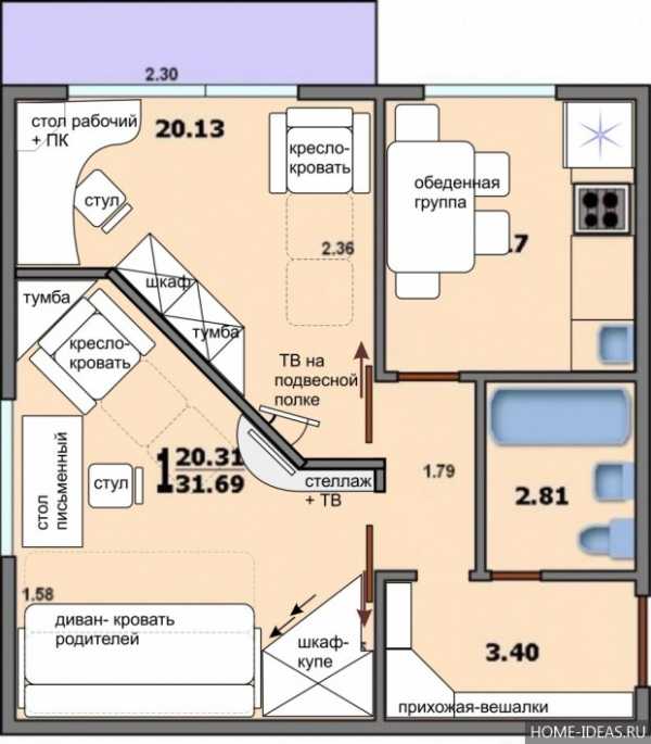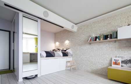 Нестандартное, при этом очень интересное решение планировки небольшой квартиры-студии предлагает использование двигающегося по рельсам гарнитура. В дневное время кровать прячется в нишу. На диване можно расположить третьего члена семьи. При этом в комнате остаётся достаточно места для подвижных игр.