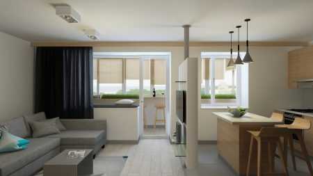 Наличие лоджии в квартире-студии любой площади предоставляет хорошую возможность увеличения пространства. Для этого балкон тщательно утепляется, осуществляется отделка стен, пола и потолка. Предварительно стоит продумать назначение дополнительных квадратных метров. Оптимальным вариантом является размещение на лоджии кухни-столовой. В таком случае часть стены не нужно сносить, а на место подоконника стоит монтировать столешницу.