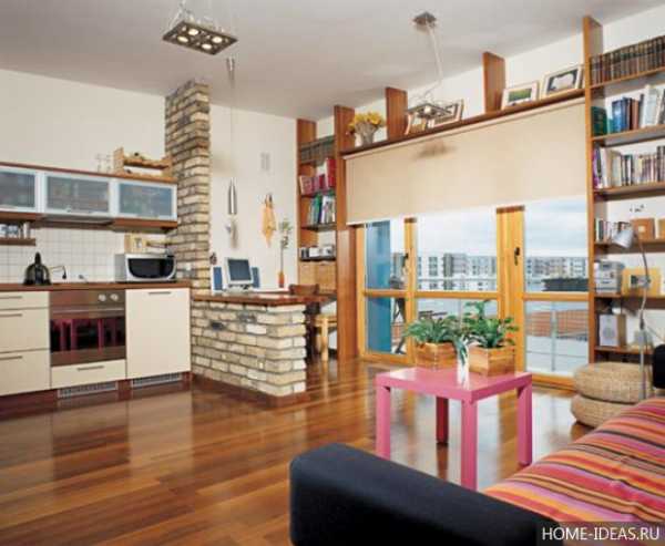 Помещение квадратной формы позволяет расположить все зоны в одном пространстве. При этом не используются перегородки, а кухня и спальное место находятся друг напротив друга. Квартира становится просторной, светлой и уютной. Неудобства возникают при приготовлении пищи.