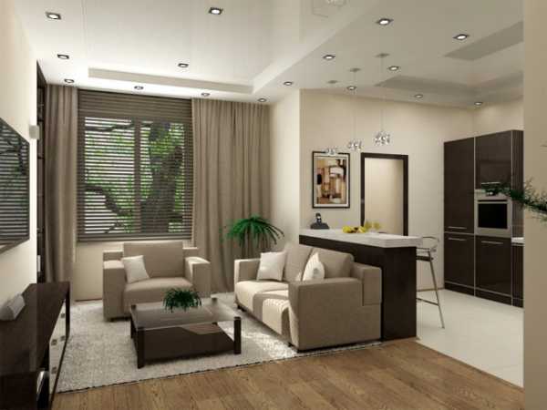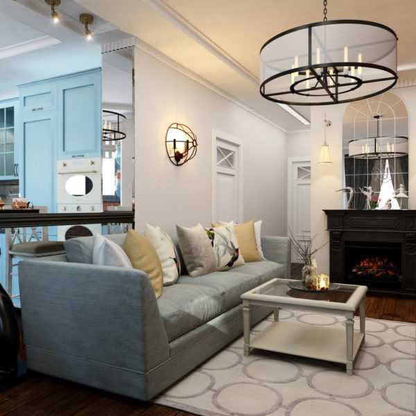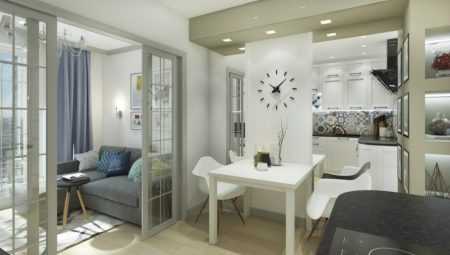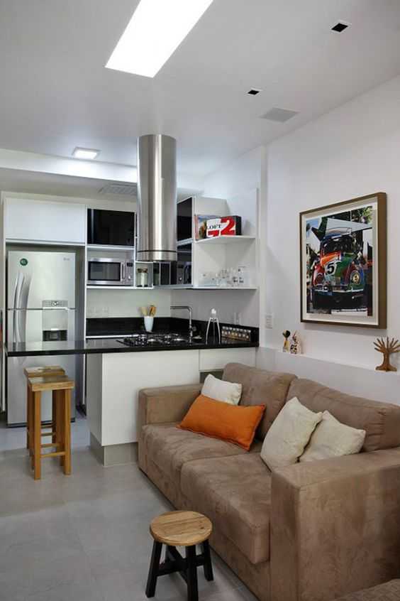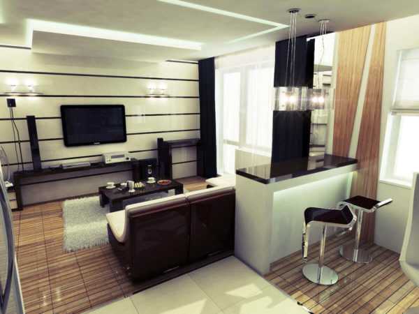 Область приёма гостей может сочетаться с кухней или спальной-гостиной. Для этого подходит интерьер в нейтральных оттенках. Стили прованс, минимализм оптимальны для кухни или спальни, совмещённых с гостиной. Основной акцент стоит делать на компактную и универсальную мебель, не занимающую много места.