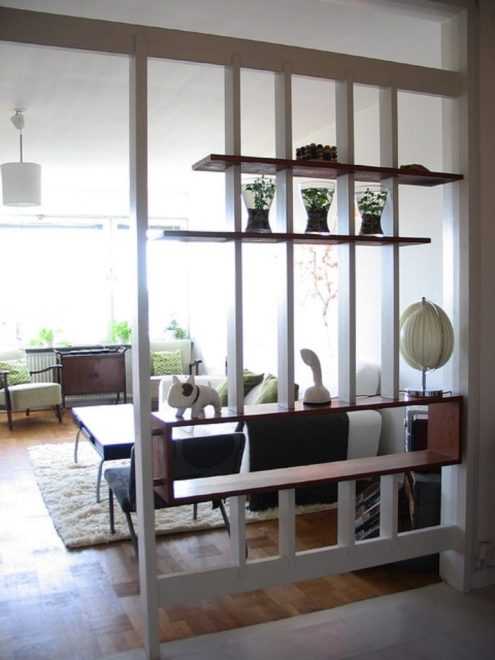 Стеллажи, узкие шкафы и другие варианты мебели подходят для разделения зон в квартире-студии. Этот вариант довольно просто в реализации и позволяет сделать перегородку функциональной. При этом особенно удобен стеллаж, полки которого находятся с двух сторон.