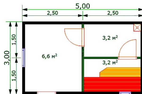 - Если баней будете пользоваться в зимний период то обязательно нужен будет входной тамбур который уменьшит поступление холодного воздуха в баню при входе в неё. Обычно тамбур делают небольшой около 1 кв.м.