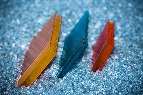- Производство поликарбоната – достаточно интересный процесс, во время которого происходит плавка специальных пластиковых гранул и формовка готовой массы в листы. Каждая отдельная пластина материала очень тонкая, но уже при толщине сотового поликарбоната для теплиц в 0,3 мм, он достигает завидной прочности.