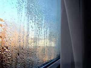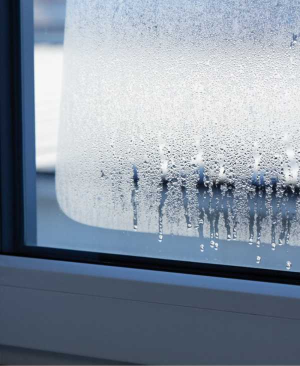 Зачастую именно повышение влажности воздуха в комнатах влияет на запотевание пластиковых окон. Оптимальный уровень влажности в жилом помещении должен составлять 40-50%. Если он превышает допустимую отметку, естественный пар в воздухе начинает преобразовываться в капли, которые оседают на поверхности, не пропускающей тепло. Стекло является холодным материалом и отлично подходит для образования росы. При плохом воздухообмене содержащий капли воздух не может вырваться наружу и “устраивается” на окнах, провоцируя сырость и возникновение плесени.