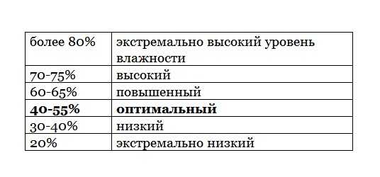 Чтобы быть осведомленным об уровне относительной влажности в комнате, необходимо обзавестись гигрометром. «Точка росы» напрямую зависит от уровня влажности и температуры за окном и внутри помещения. Чтобы иметь представление о том, какие температурно-влажностные показатели приводят к образованию конденсата, можно обратиться к следующей таблице: