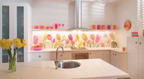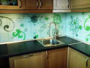 Всем требованиям для кухни обладают стеклянные панели. Мастера их называют Скинали. Стекло может иметь различные узоры, которые не выцветают. Поверхность обладает стойкостью к механическим повреждениям и может стать лучшим вариантом на кухне.