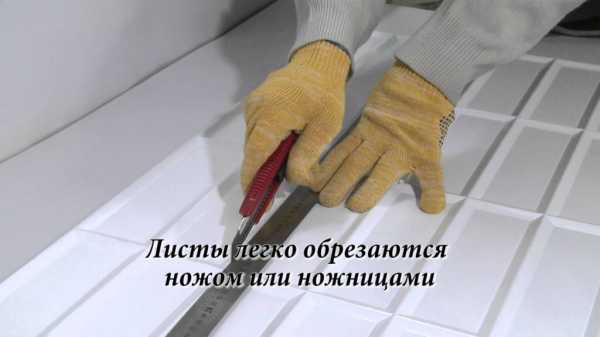 Затем панель измеряется и выпиливается из нее нужная часть. Пилить лучше электролобзиком. Спиленные части устанавливаются к потолку или к полу. Видимая часть должна быть с четким рисунком цельных плиток. Перед установкой на каждую деталь влагостойкой стеновой панели с обратной стороны наносится слой клея толщиной 5 мм. Особенно хорошо клей наносится на края листа. Можно клеить и с применением жидких гвоздей.