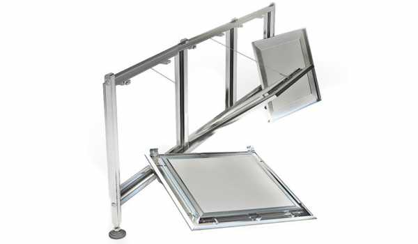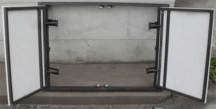 - Откидные. Здесь при нажатии на дверцу, она откидывается под углом в 45 градусов, фиксируясь на цепочке с карабинами. Этого обычно хватает для проведения планового осмотра коммуникаций или списывания показаний счётчиков. Если нужно обеспечить полный доступ, например, при проведении ремонтных работ, карабины отщелкиваются и люк убирается в сторону.