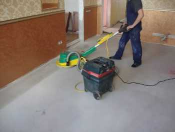 Шлифовка основания для стяжки- Если на поверхности основания обнаруживается значительное количество дефектов, то в редких случаях применяют способ, предусматривающий предварительную просыпку песчаной смесью. Этот способ используют и при значительных перепадах уровня пола, с целью равномерного распределения нагрузки на поверхность гидроизоляции.