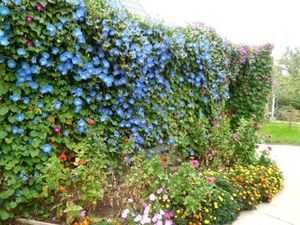 Ипомея — плетущиеся цветы (фото выше), наиболее часто используемые для оформления заборов и изгородей. При этом совершенно не играет роли тип опоры: соседнее дерево, стена дома и пр. Ипомея создает живой ковер, украшенный множеством крупных (до 10 см в диаметре), причудливо изогнутых воронковидных цветов. Палитра оттенков варьируется от белого до темно-синего, бордового и насыщенного фиолетового. На фоне зеленой листвы получается яркий контраст.